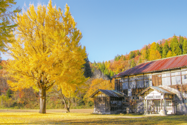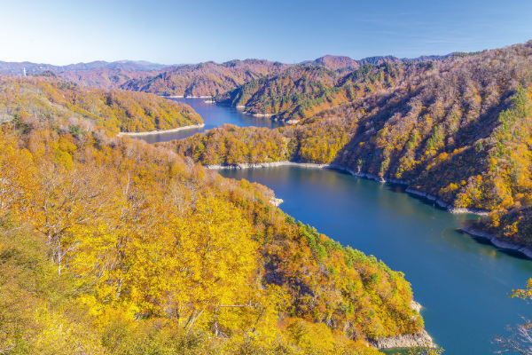 Lake Tagokura in Tadami Town is a large reservoir located on the border with Niigata Prefecture. It is an artificial lake created by the Tagokura Dam, which dammed the Tadami River, and boasts one of the largest water storage capacities in Japan. The peak time to see the autumn leaves is usually from mid to late October, when beech, maple, and other broad-leaved trees turn color, painting the area around the lake in shades of red and yellow. Visitors can enjoy panoramic views of the autumn foliage and the lake from the Tagokura Dam Observation Deck and along Route 252.