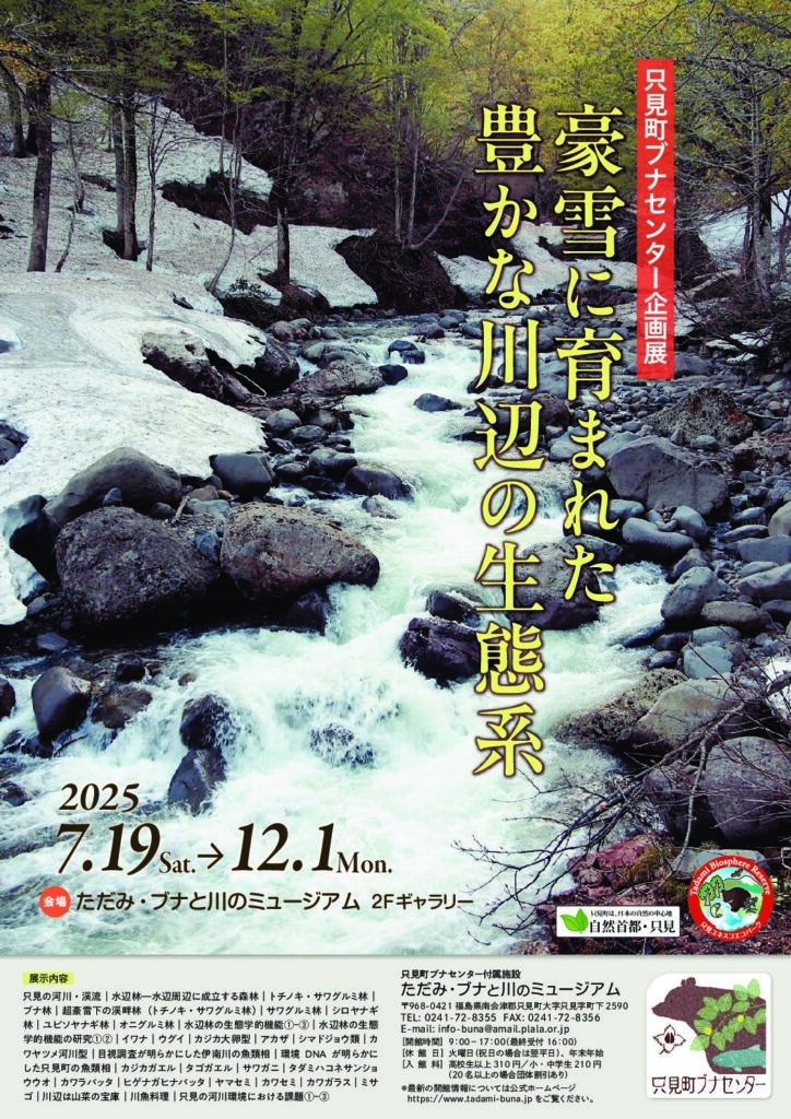 本企画展では、只見町の生命の源ともいえる川辺について展示・解説します。一体どんな渓流・河川があるのか、川辺にはどんな森林が発達し、どのような野生動植物がいるのか、人の暮らしとの関わり、さらには、次世代にこの豊かな自然を引き継ぐことの重要性を共有します。
